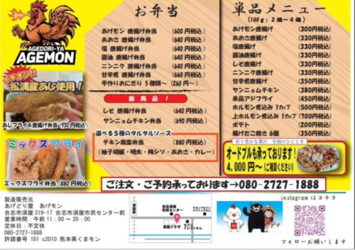 こちら「あげモン」ではお弁当の大量注文も歓迎との事。お引き取りの3日前までに TEL 080‐2727‐1888 こちらにてご注文されてください。