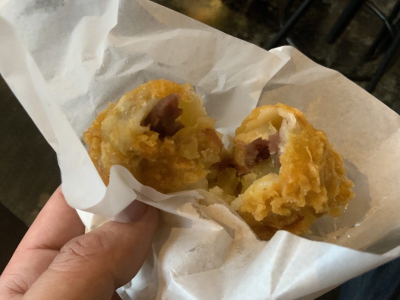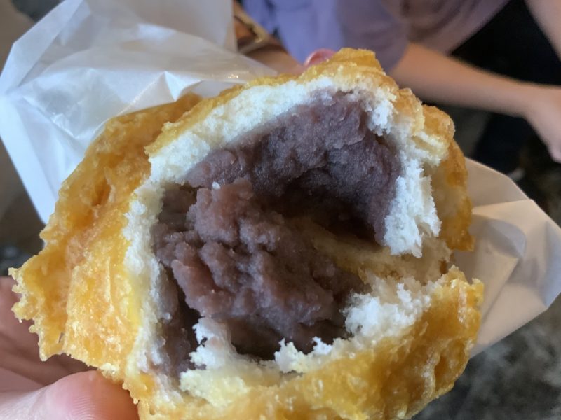 これ、いもあんでした。さつまいもを揚げたみたいで甘みが引き立ち美味しいのですが、まんじゅうのふわふわの皮とサクサクの衣がたまりません。