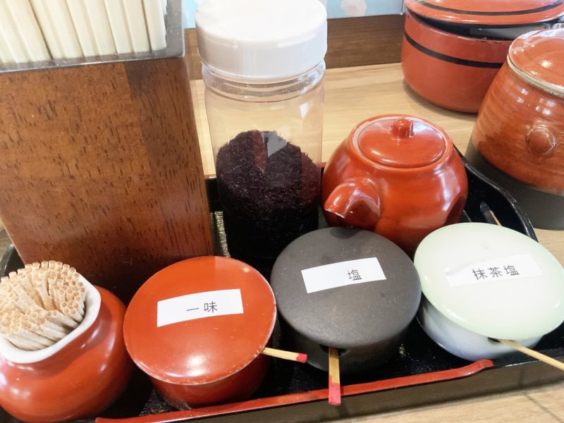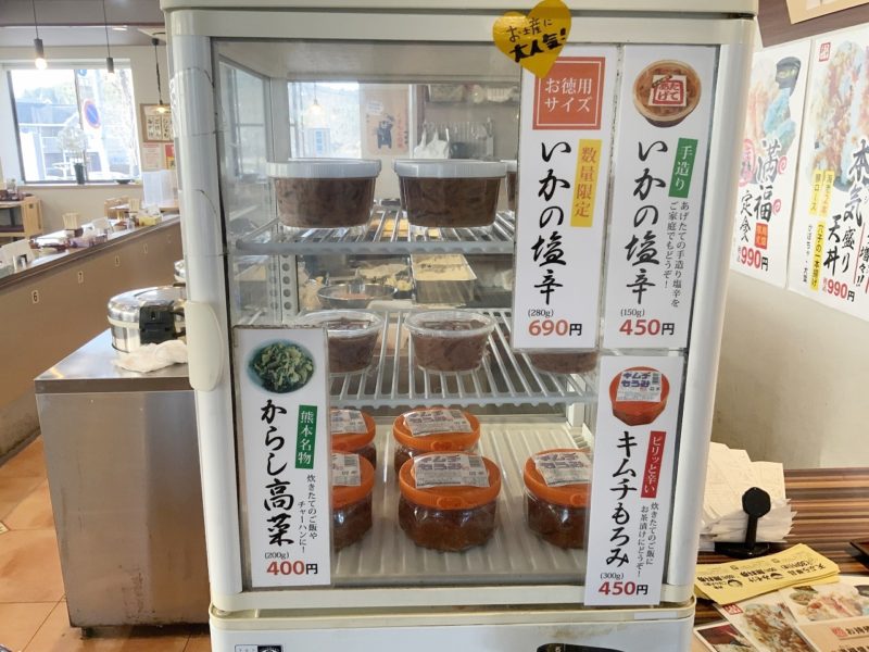 塩辛以外にも天ぷら用の塩、ゆかりや高菜漬けなどあるので味変には困りません。