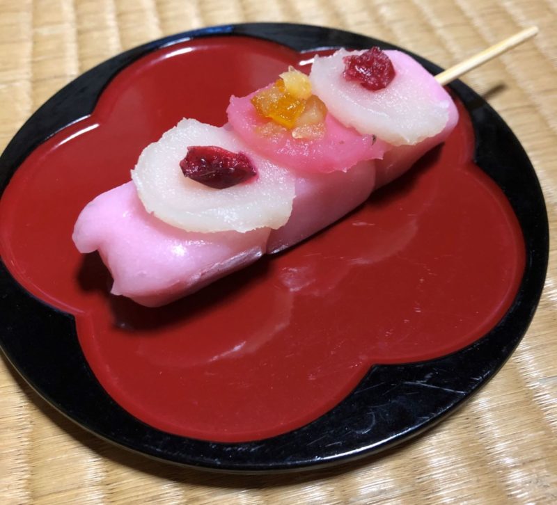 ピンクのお団子にオレンジとクランベリーの乗ったフルーツ串。