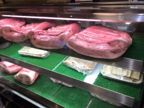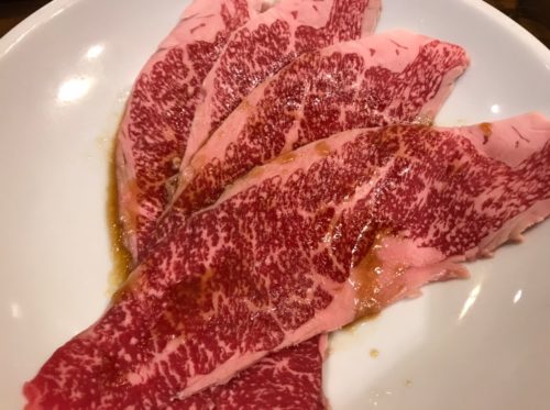 この日のお肉は、熊本県産の黒毛和牛。店長のお話によると、和牛は2~3日ごとに、主に前バラ(ブリスケ)を枝肉で仕入れられているそうです。産地は、熊本、鹿児島、宮崎、佐賀など、ほぼ九州産。ランクはA4~A5ランクで、和王も入ることがあるそうで、食べ放題とは思えない質の高さ!