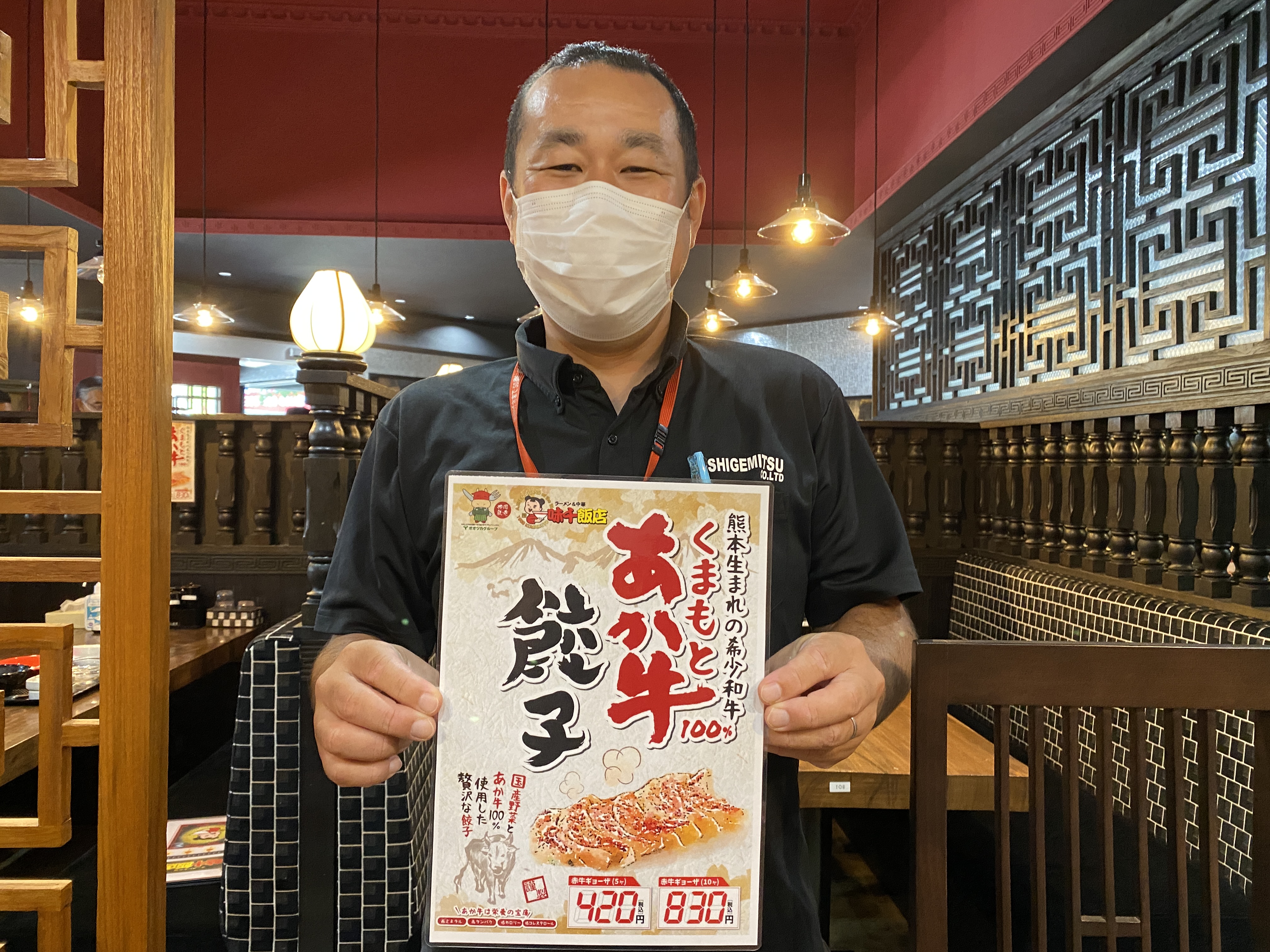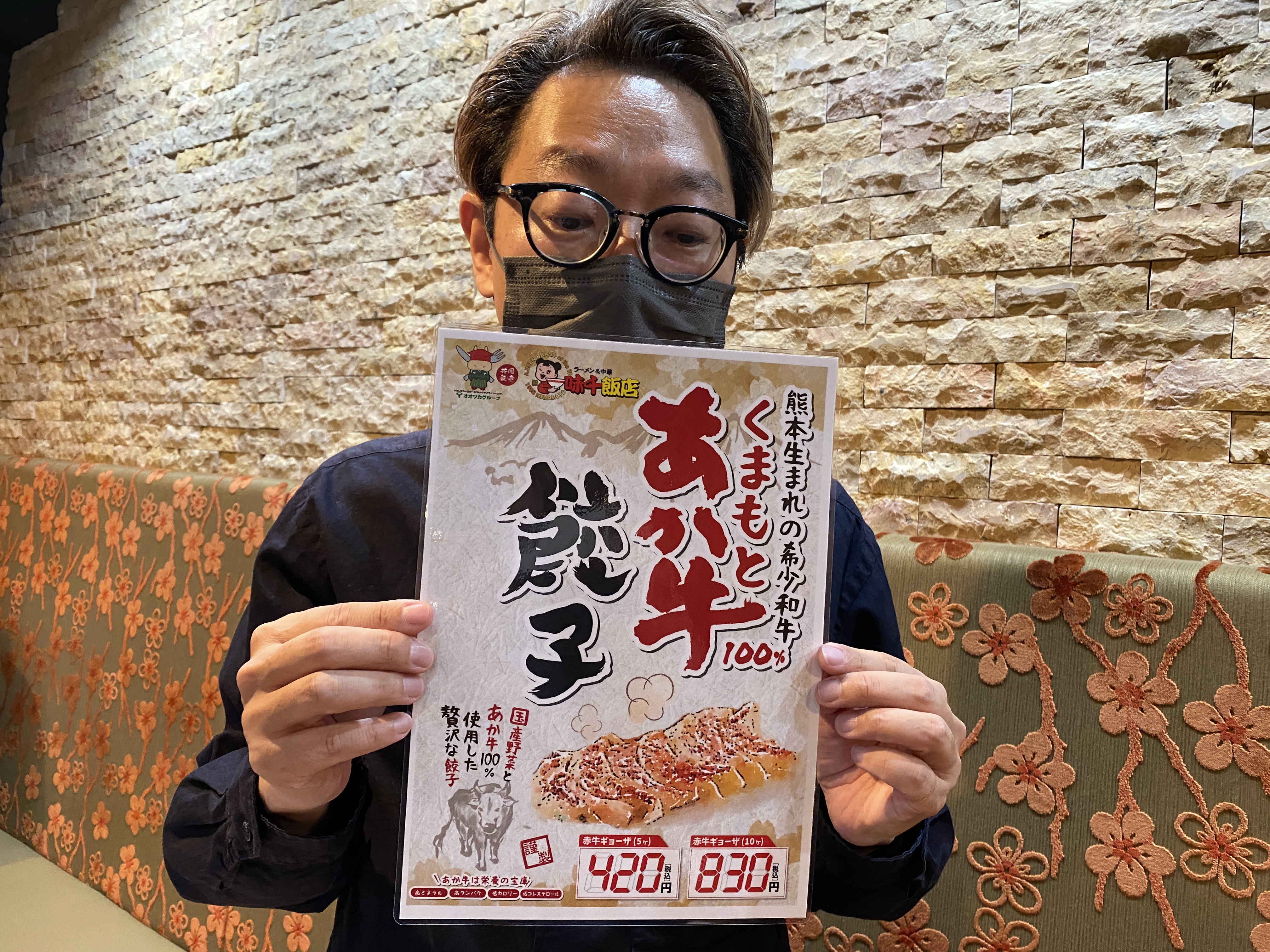 聞くと、このおすすめ餃子、なんと熊本のあか牛を100%使用という贅沢餃子。肉のオオツカとの共同開発で生まれた新メニューで、ここ味千飯店でしか食べられない一品なんです。