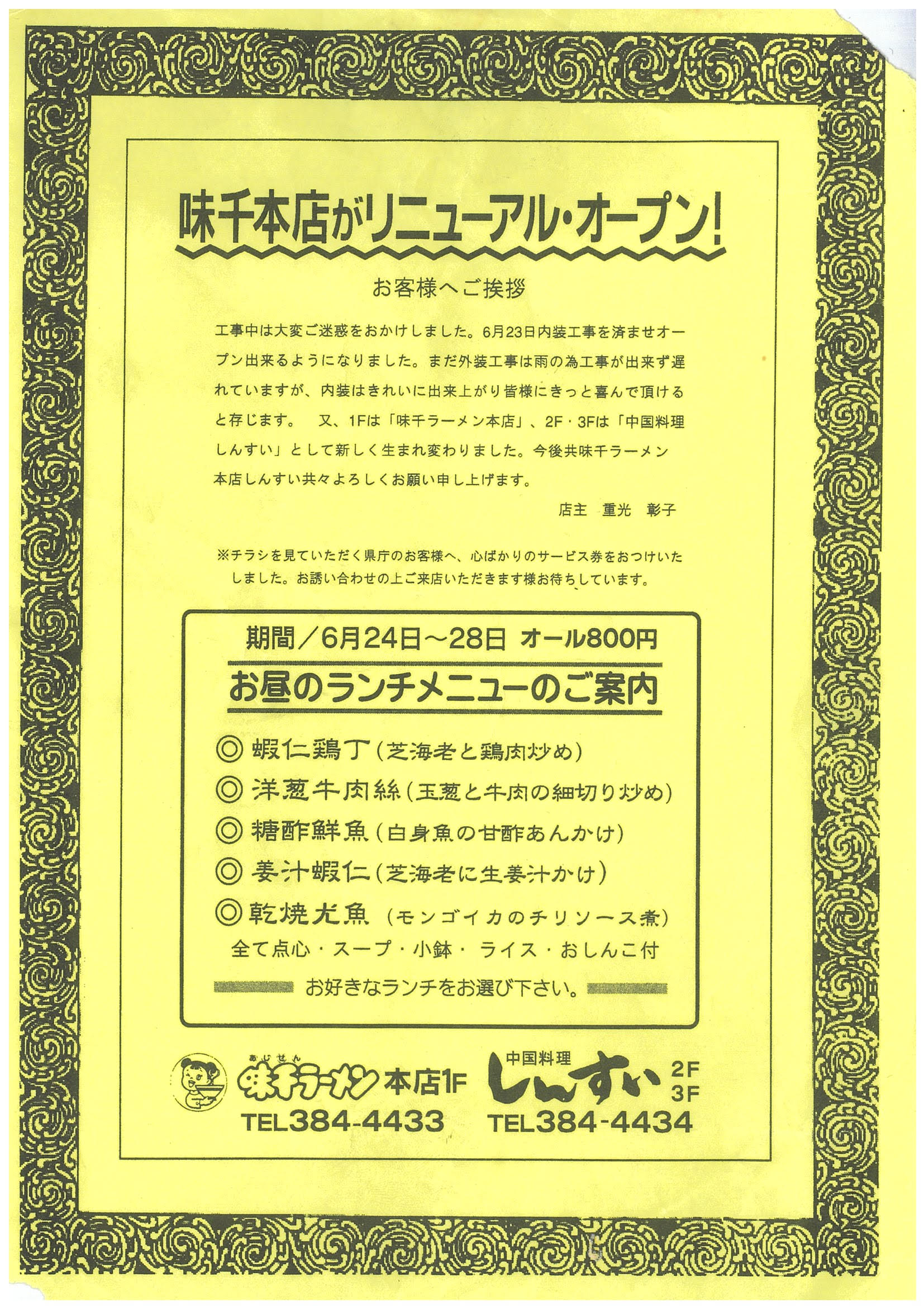 現在の本店の場所に味千本店がオープンしたのが、昭和43年(1968年)。