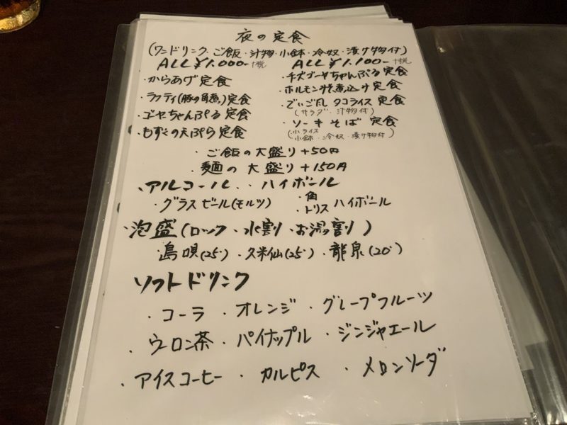 ちなみに、夜も定食があるそうで、お酒を含むワンドリンク付きで1000円(税別)~と晩酌にちょうどいい感じです。