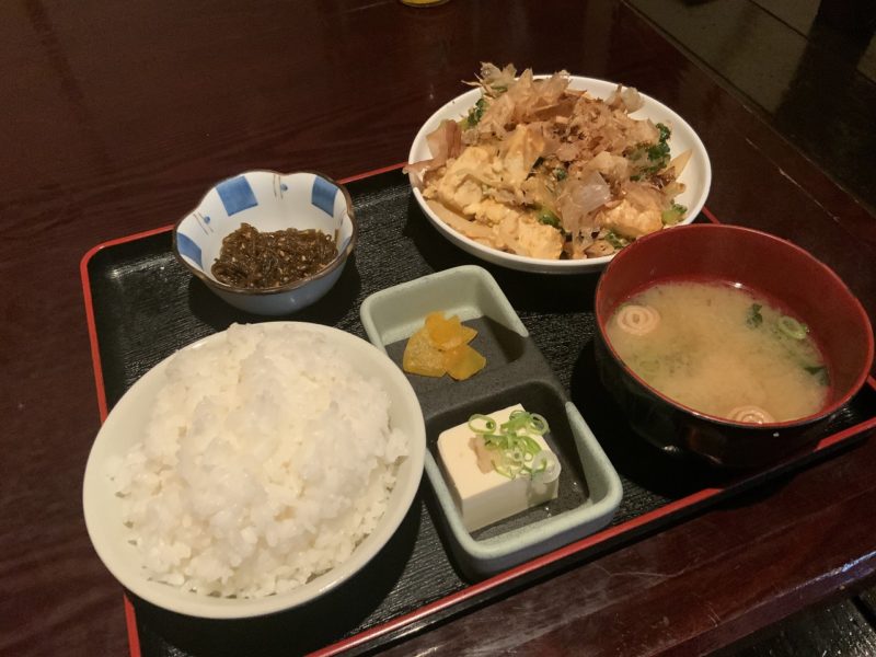 ごはんもゴーヤーチャンプルもたっぷりで、お味噌汁と小鉢に豆腐と漬物、沖縄もずくがついてきます。