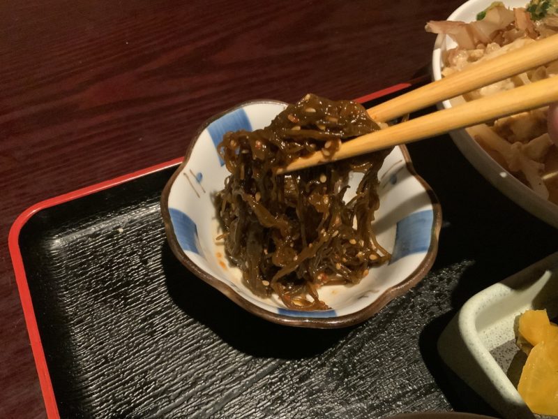 小鉢のもずくも、沖縄から仕入れた沖縄もずくを味付けしたもので、この日はキムチもずくでした。