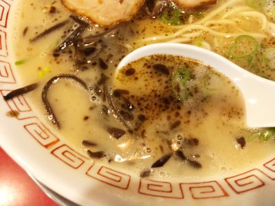 スープは焦がしにんにくの香りに食欲がそそられます。中には黒マー油が入っています。とんこつの濃いコクがありますが、後味があっさりとしているのでとんこつラーメンが苦手な方でも楽しめます。チャーシューもとろとろとやわらかくておいしかったです。