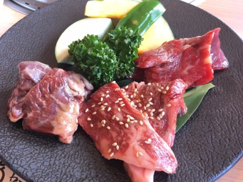 こちらが、あか牛を使っていておすすめというあかいとランチ。上カルビ、上ロース、ハラミの3点盛りで1,680円(税別)です。汁物はわかめスープか味噌汁かを選べます。