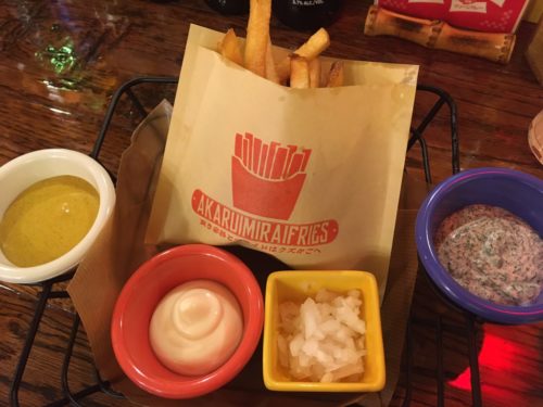 こちらが、今後さらに改良予定というフライドポテト。ひと手間加えたマヨネーズと玉ねぎはおかわり自由で、ディップソースはなんと15種類から選べます。