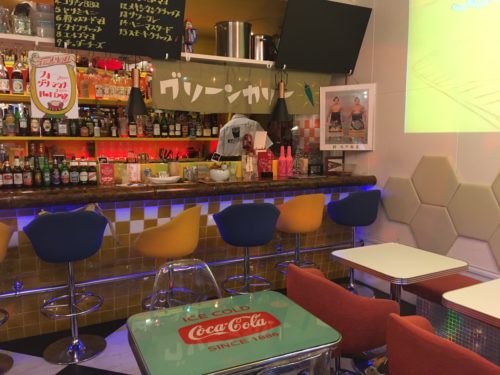 店内は、バーカウンターにイステーブルが並び、カラフルでポップな雰囲気です。