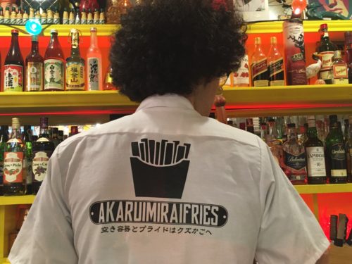 スタッフのシャツの背面にも、「空き容器とプライドはクズかごへ」というコピーとともに、フライドポテトのイラストがプリントされています。ちなみにこちらの高橋さんの髪型は完全なる地毛だそうです。