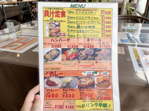 メニューはこちら。たっぷりの貝汁にメインのおかずがつく定食が人気です。