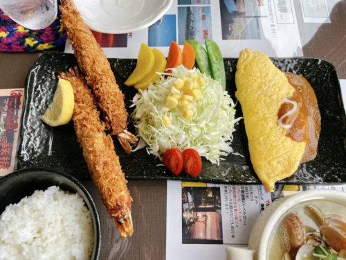 ご飯に貝汁、大ぶりのエビが2本に、とろんとした食感のオムレツとサラダ、お漬物もついて大満足のランチでした。