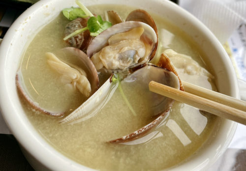 持ち手付きのカップになみなみと入った貝汁は、アサリの旨味がたっぷり。