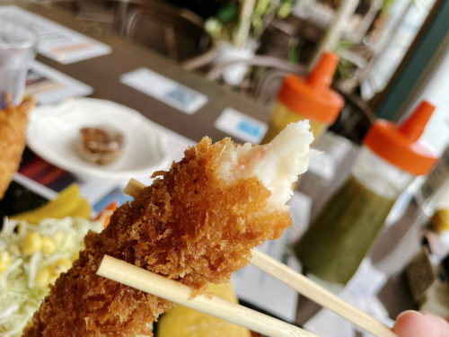 大きなエビフライはタルタルソースとレモン付き。サクサクの衣は薄め、ミディアムレアくらいのエビとのバランスも絶妙です。頭からしっぽまでいただきました。