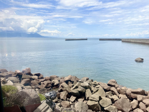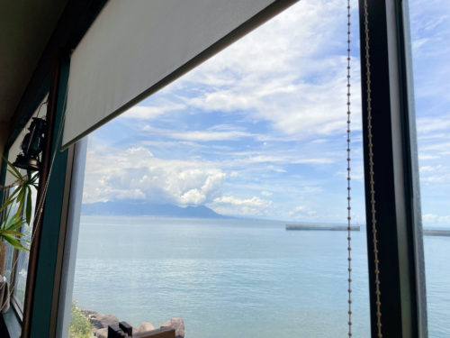 目の前は有明海、満潮時には窓の外すぐのところに波打ち際が迫ります。この日は少し雲がかかっていたけれど、左奥は雲仙。島原半島まで見渡せますよ。