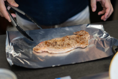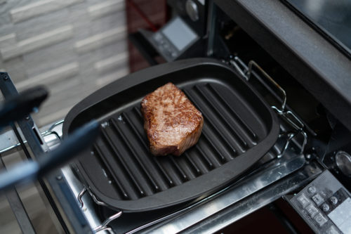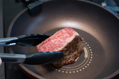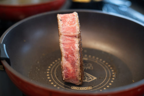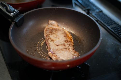 ジュ―っという音を期待してたのですが、まさかの無音。最初から温めすぎると焦げるだけなので、肉を置いて数秒後に音が出るくらいの火加減がいいのだとか。