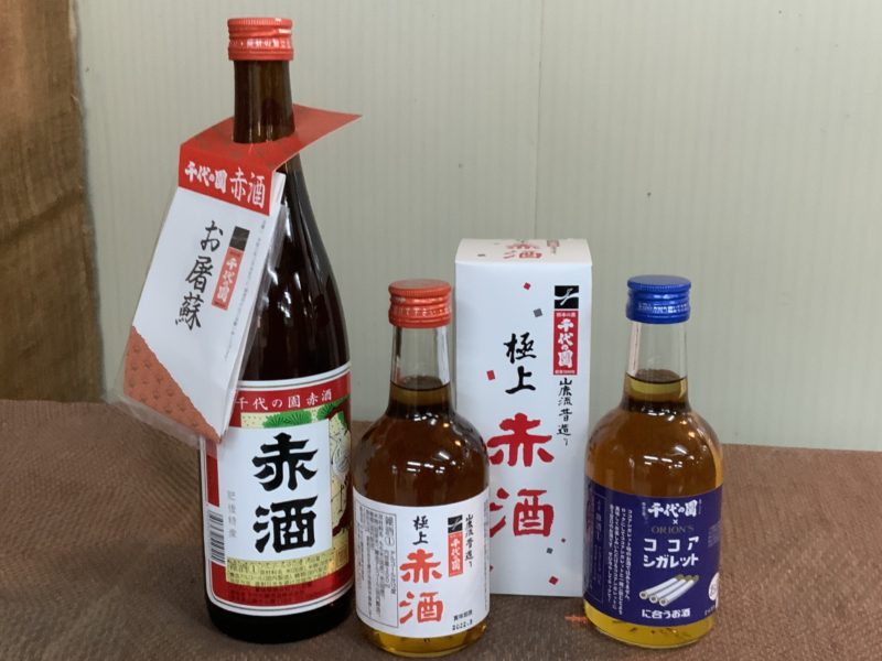 千代の園で作っている基本的な赤酒はこちらです。左から、「極上赤酒」「肥後特産赤酒」「料理用赤酒」です。よく目にするのは真ん中の肥後特産赤酒ではないでしょうか?
