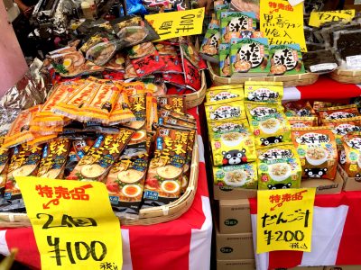 インスタントのだんご汁やインスタント太平燕がたくさん販売されていました。アベックラーメンが2個100円ってスーパーの安売り日より安いですね!!これは買うしかありません!!!