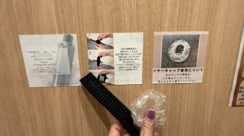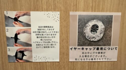 もし髪の毛まではいいやという人はヘアーキャップや、酵素や汗が耳に入るのが嫌な方はイヤーキャップも用意してありますよ。