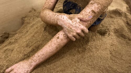 スタッフさんにパウダーをかけてもらい埋もれていきます。