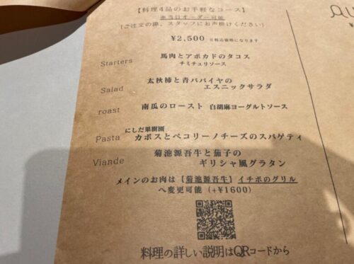 夜は当日オーダーも可能な、料理4品で2,500円のコース料理や、単品料理、さらに5,800円の予約制のコースがあります。