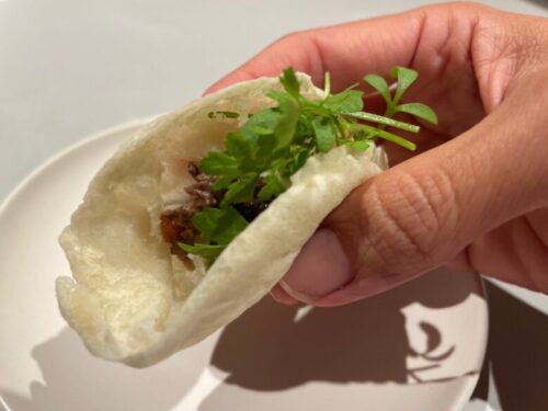 馬肉のタコスにはマヨネーズソースとハーブソースがかけられていて、まん丸い生地を自分で折り、挟んでいただきます。