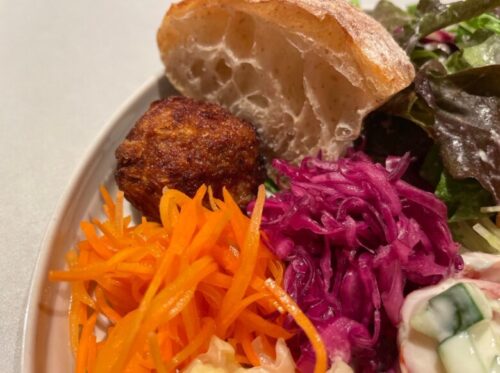 サラダプレートとは言うものの、お肉がすごいボリュームで、バゲットや馬肉メンチカツもついているので、しっかり食べ応えもあります。