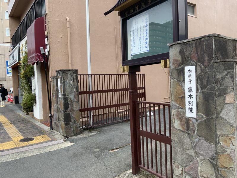 近くで鐘を鳴らしてそうなところ…とたどり着いたのが「浄土真宗本願寺派熊本別院」でした。本願寺の熊本支社みたいなイメージのところです。