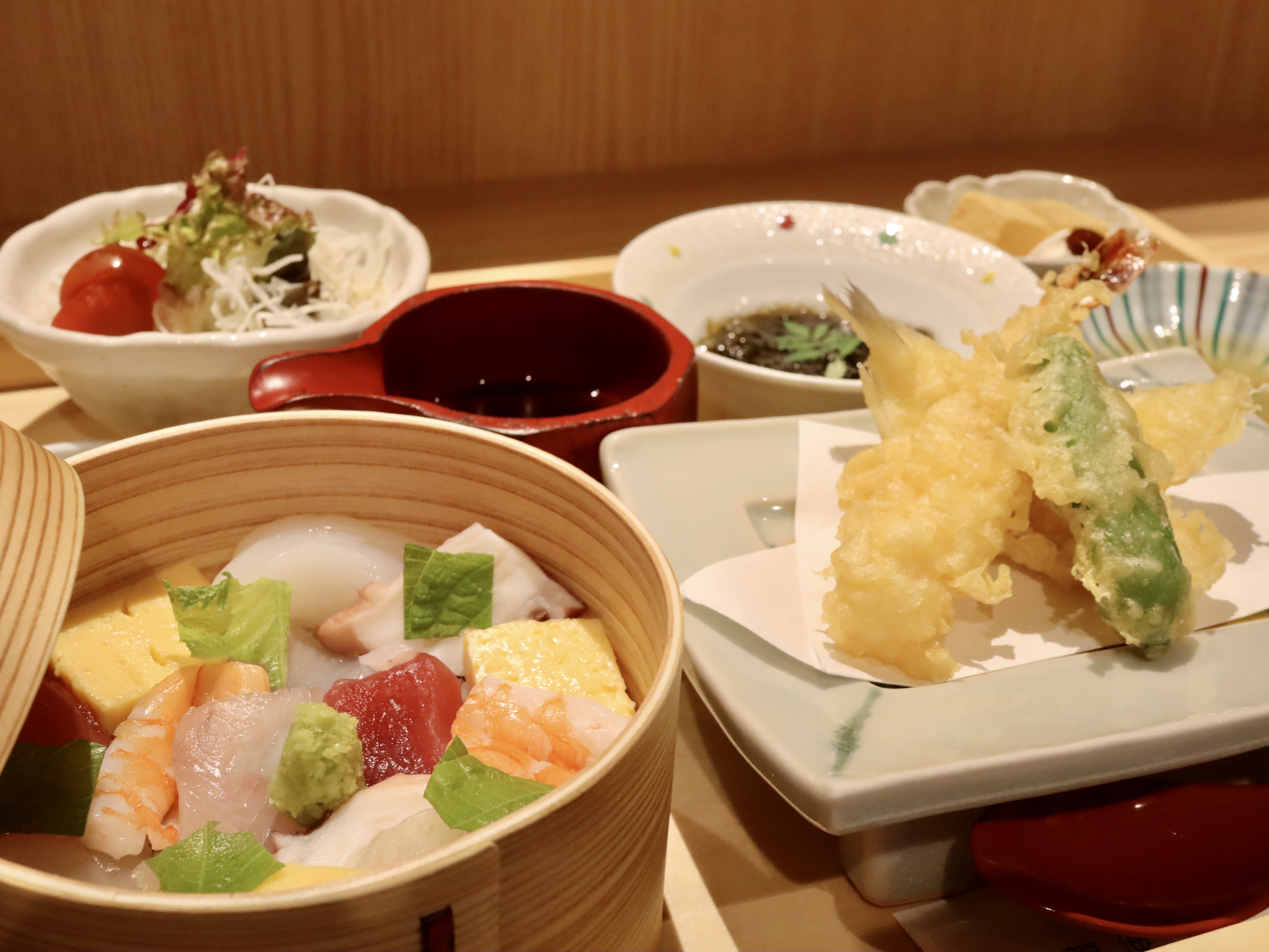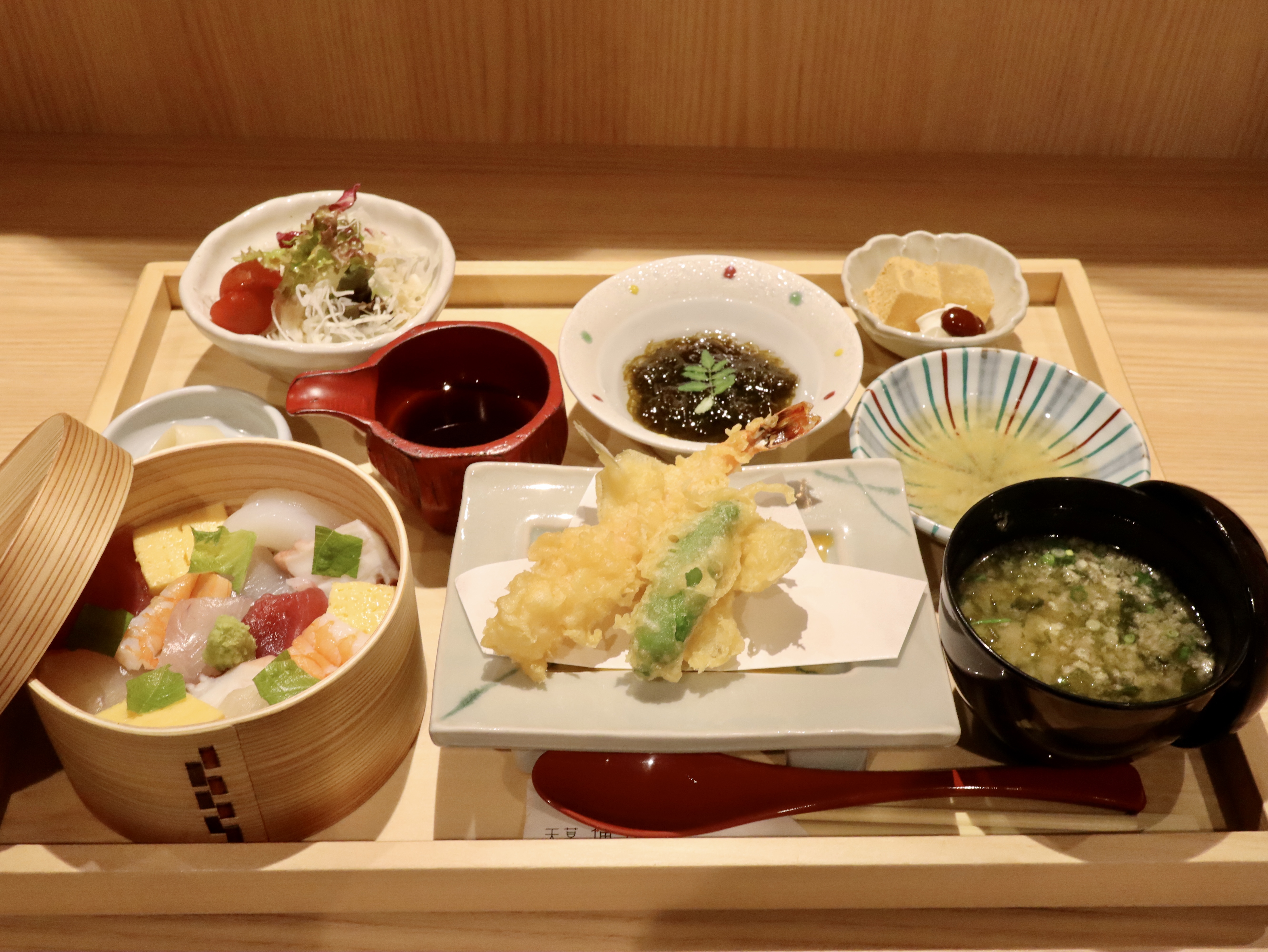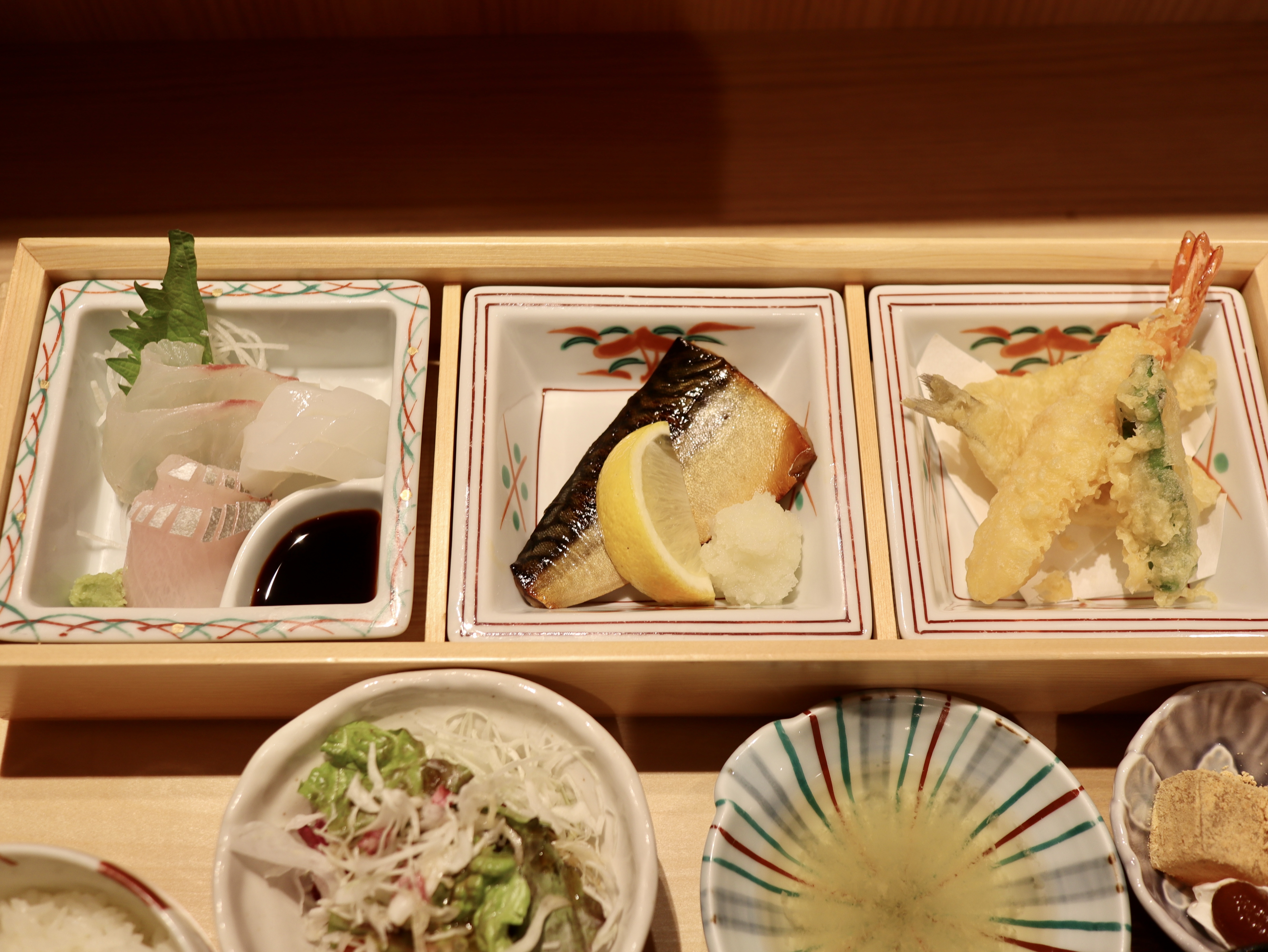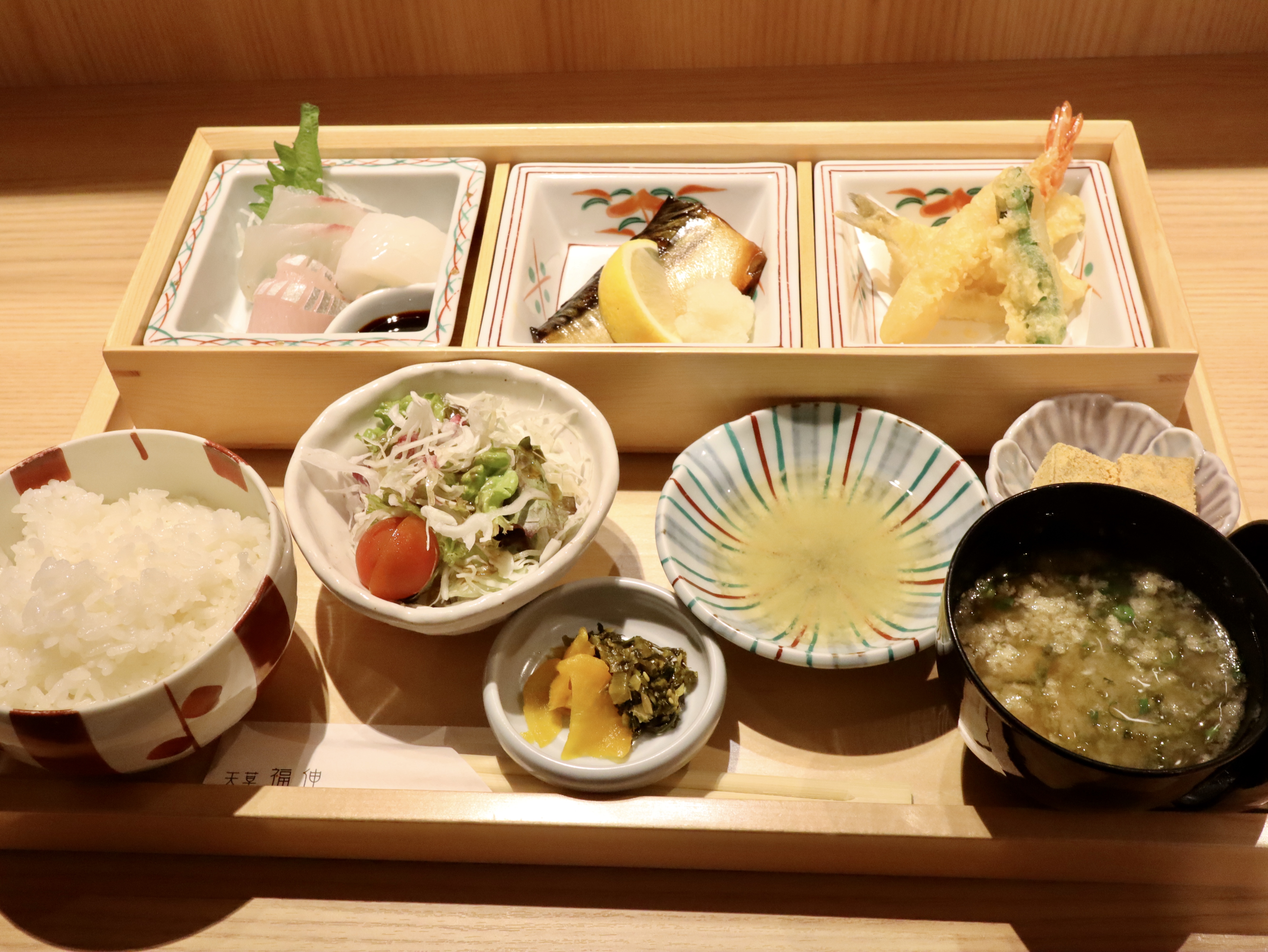 小鉢、天ぷら、刺身、さば(煮つけもしくは照り焼き)、サラダ、ご飯、味噌汁、漬物、甘味がついた贅沢御膳。