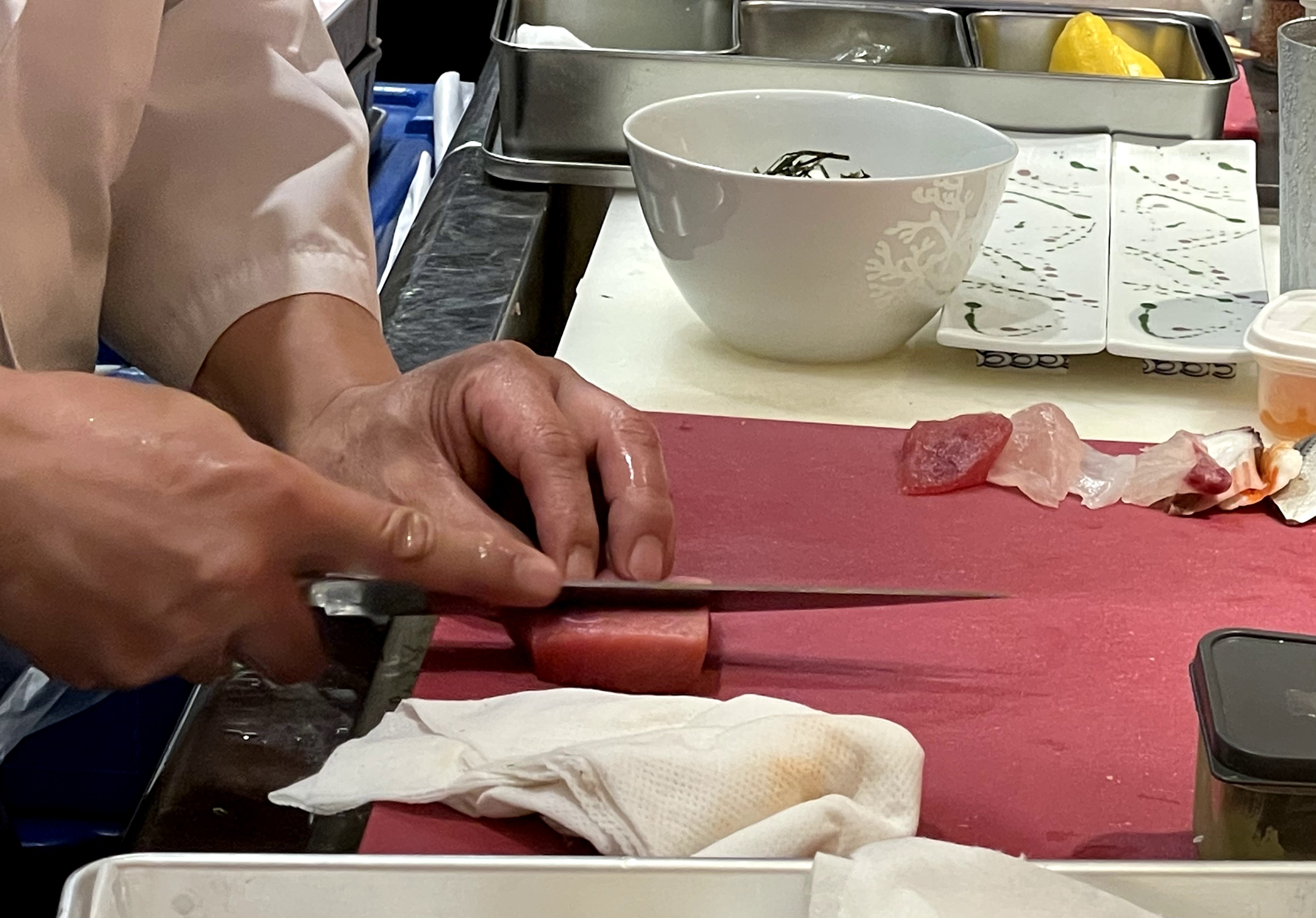 目の前で職人さんが作る工程をライブ形式で見れるのはもちろん、その息づかい、真剣なまなざしを直に見れるのでお料理を待つ時間が楽しく過ごせます。