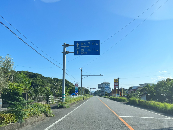 教えてもらった道を進みます。ループ橋を熊本市方面へ行き、266号線をそのまま先へ。前方にコメリが見えたらその手前を左折します。