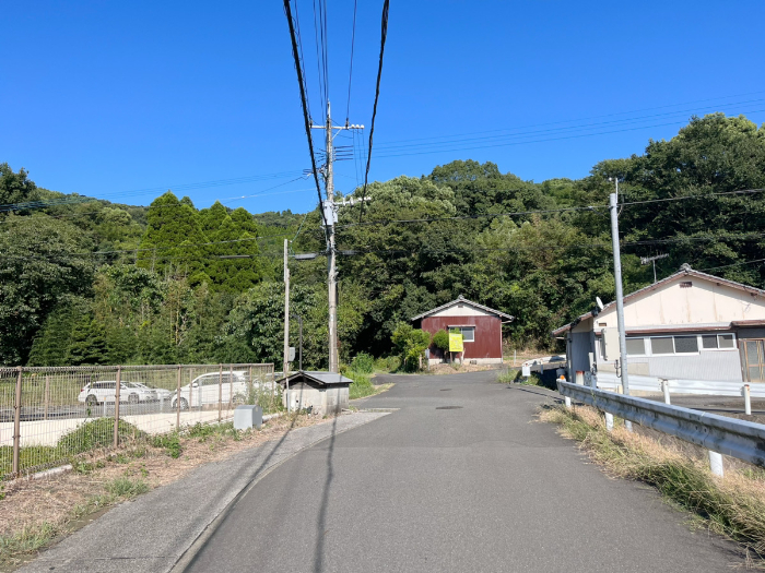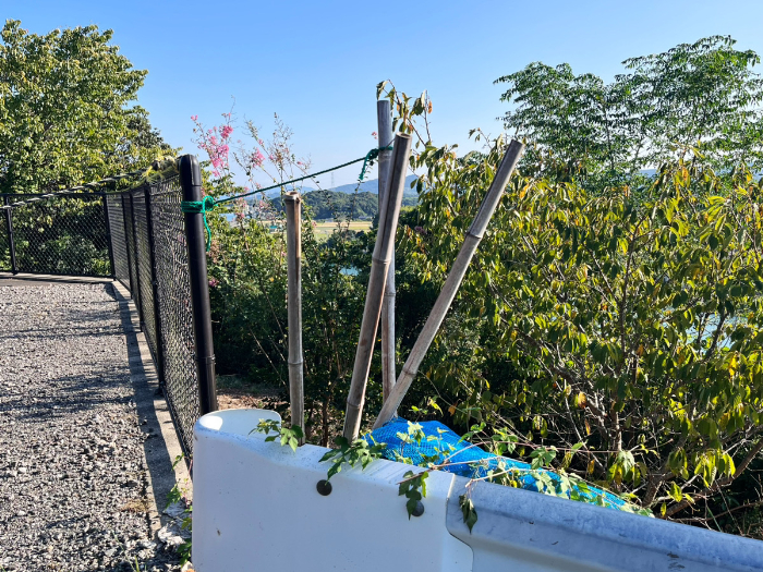 体育館を出て、少し山の方へ向かうと黄色い看板が。