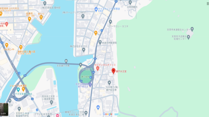 まずは、ループ橋の近くにある神社を探します。マップ上で確認できる神社は1ヶ所だけ。