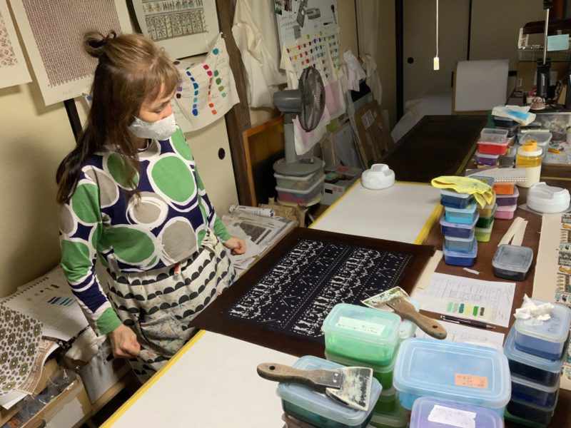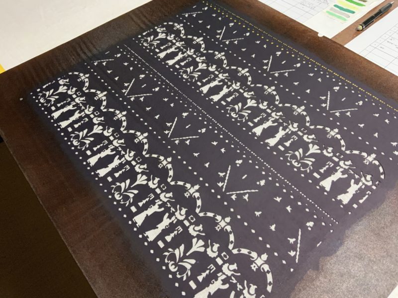 こんな細かい模様の型まで5~10枚ほどを使用して染めていくそうです。ミリ単位のズレも許されない職人技。