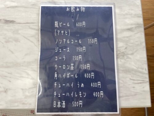 飲み物は、瓶ビールやハイボールといったアルコール類に、ジュースは150円ととってもお手頃!