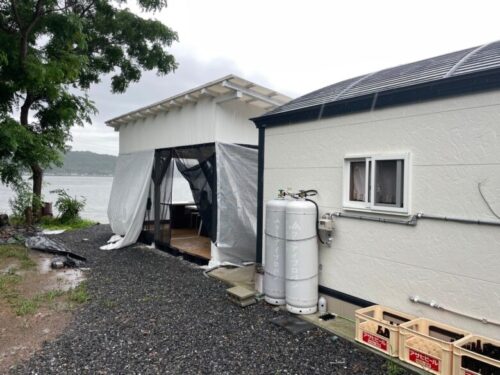 正面から裏手にまわって、海側の白い屋根の建物がお店、右側の黒い屋根の小屋が厨房になっています。