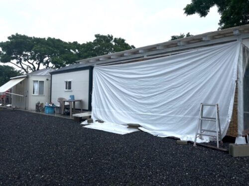 すると突き当りに現れるのが、白い垂れ幕のプレハブ小屋のような場所。