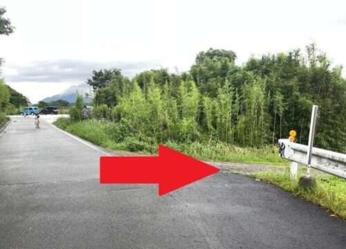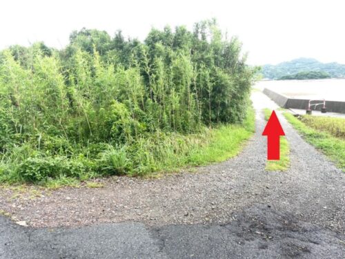 奥にある水色の車がとまっている広い駐車場がHui Cafeの駐車場なのですが、その手前のガードレースが途切れたところから右折します。