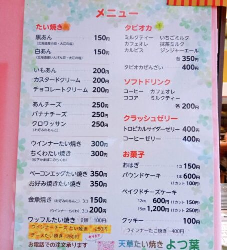 ご紹介したメニュー以外にも芋あんやカスタード、たい焼き以外のタピオカやゼリーと美味しそうなものがいっぱいの「よつ葉」に、ぜひ行ってみてください。