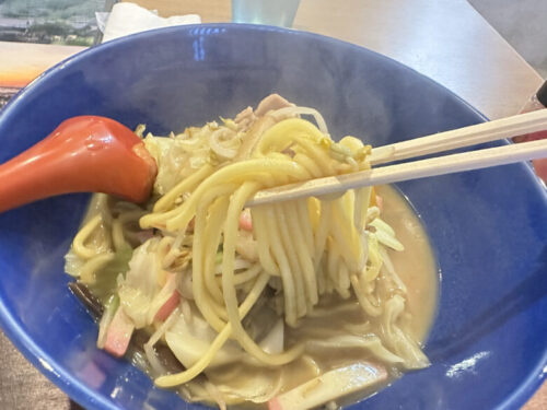 つるつるのちゃんぽん麺。スープの味がよく絡みます。