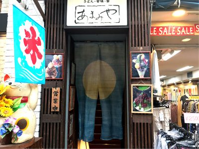 上通アーケード沿い洋装店タバラの上階にある「あまみや」。お店は抹茶やきなこを中心とした和風スイーツで有名なお店です。