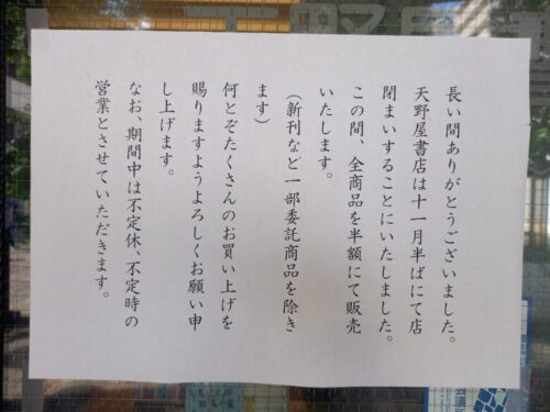 あの熊本市の老舗古本屋「天野屋書店」が、11月中旬で閉店されるとのこと。