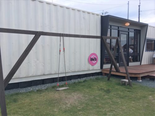 コンテナのようなかわいい外観の小さなカフェで、お店前のお庭にはブランコもあります。