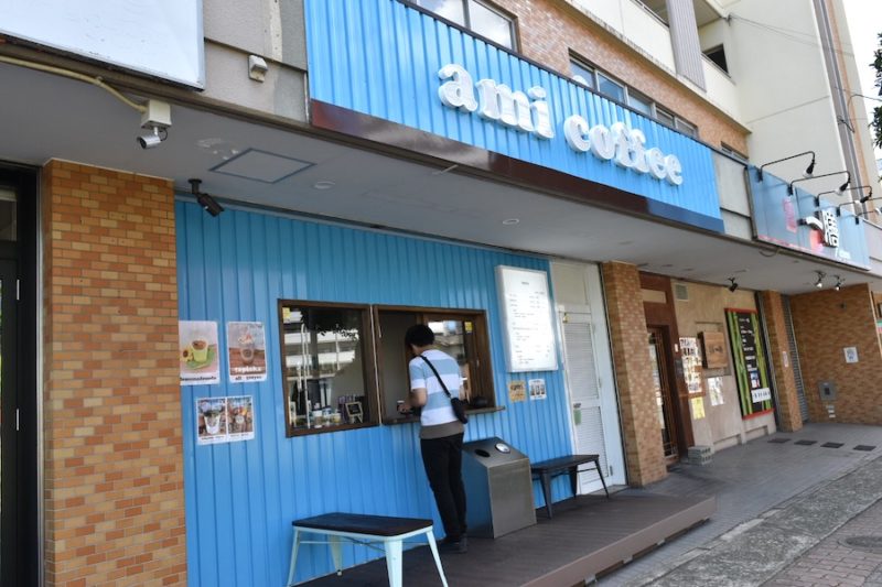 鮮やかな水色の外観が目立つ「ami coffee」。中央区九品寺。産業道路から一本入ったところのコスモスとかある辺り。あの真ん中に三角のスペースがある交差点沿いです。