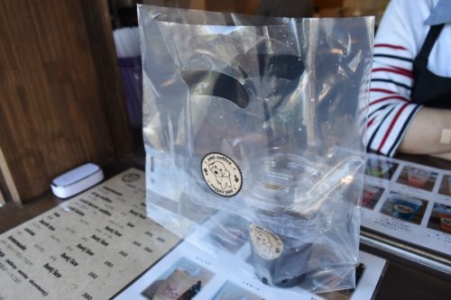 複数購入すると、お持ち帰りしやすいように、なんと中でカップが立つ袋に入れてくれます。これは移動が楽になる!
