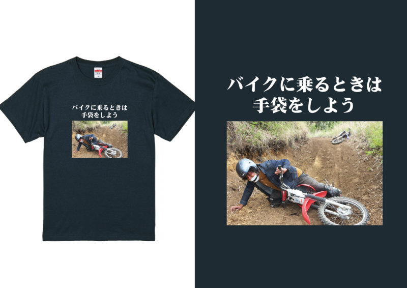 2つ目は、表面に私がオフロードバイクに乗ってころんだときの写真ですね。読者から「手袋しないと危ない!!」と怒られたので反省の気持ちと注意喚起の意味合いで。裏面は某ブランドのロゴマークのパクリで肥後ジャーナルを表してみました。