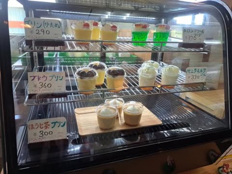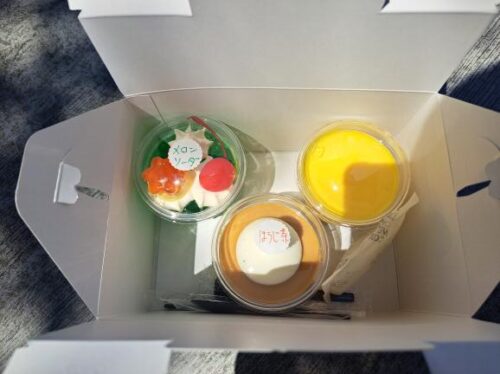 購入したのはプリンと、メロンプリームソーダ、ほうじ茶プリンの3つです。