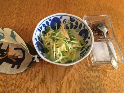 最初に、サラダと参鶏湯用の塩と山椒塩がきて…