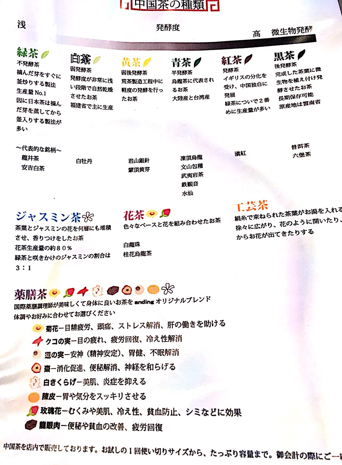 メニューを見てみると、丁寧にお茶の解説がされており、効能も詳しく書かれています。お茶の種類は、なんと約70種類というバリエーションで圧倒されます。